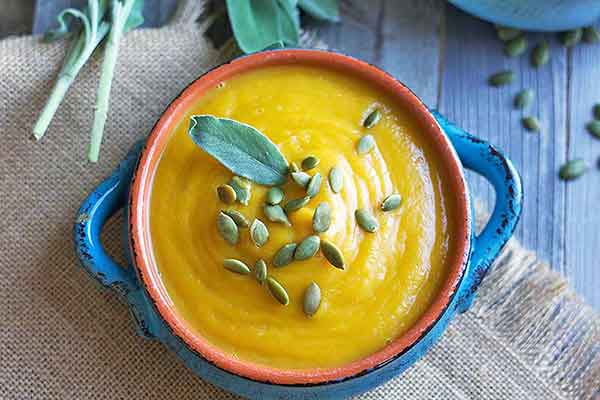 Simple, elegant, and deeply autumnal. Sweet roasted squash, aromatic shallots, and a hint of nutmeg blend into a silky, golden puree. Dairy-free? Use coconut milk. Garnish with toasted pepitas and sage.