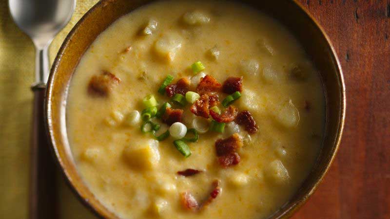 Creamy russets, sharp cheddar, and a velvety broth, crowned with crispy bacon, extra cheese, and fresh green onions. Think baked potato meets chowder—thick, indulgent, and deeply comforting. Serve with crusty bread for maximum dunking.