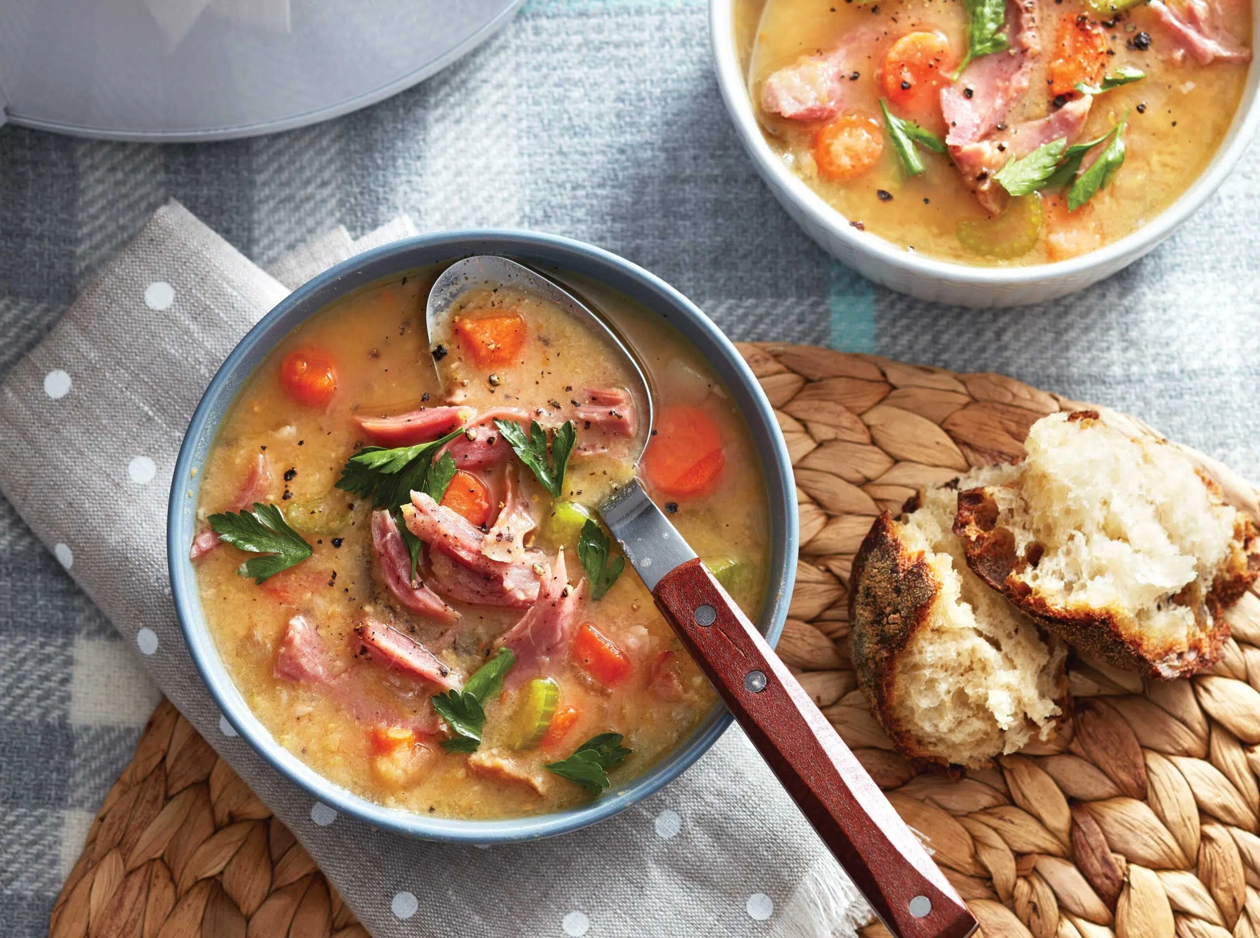 Silky, smoky, and soul-deep satisfying. Tender split peas and generous bits of ham hock (or smoked turkey) simmer with bay leaf and a touch of apple cider vinegar for balance. Rich, nostalgic, and perfect with a slice of rye.