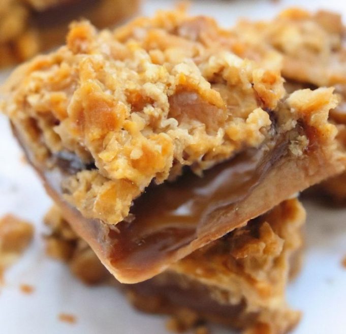 - Crumble the remaining oat mixture over the caramel layer.