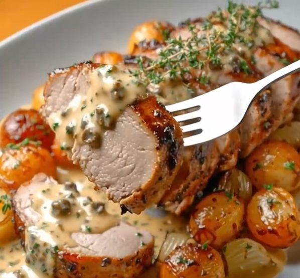 Tender, juicy pork tenderloin coated in a bold blend of old-fashioned and Dijon mustard, then seared and roasted to golden perfection. Served alongside deeply caramelized onions infused with thyme and bay leaf, this elegant dish delivers rustic charm with gourmet flair—ready in under an hour and perfect for weeknights or weekend dinners.