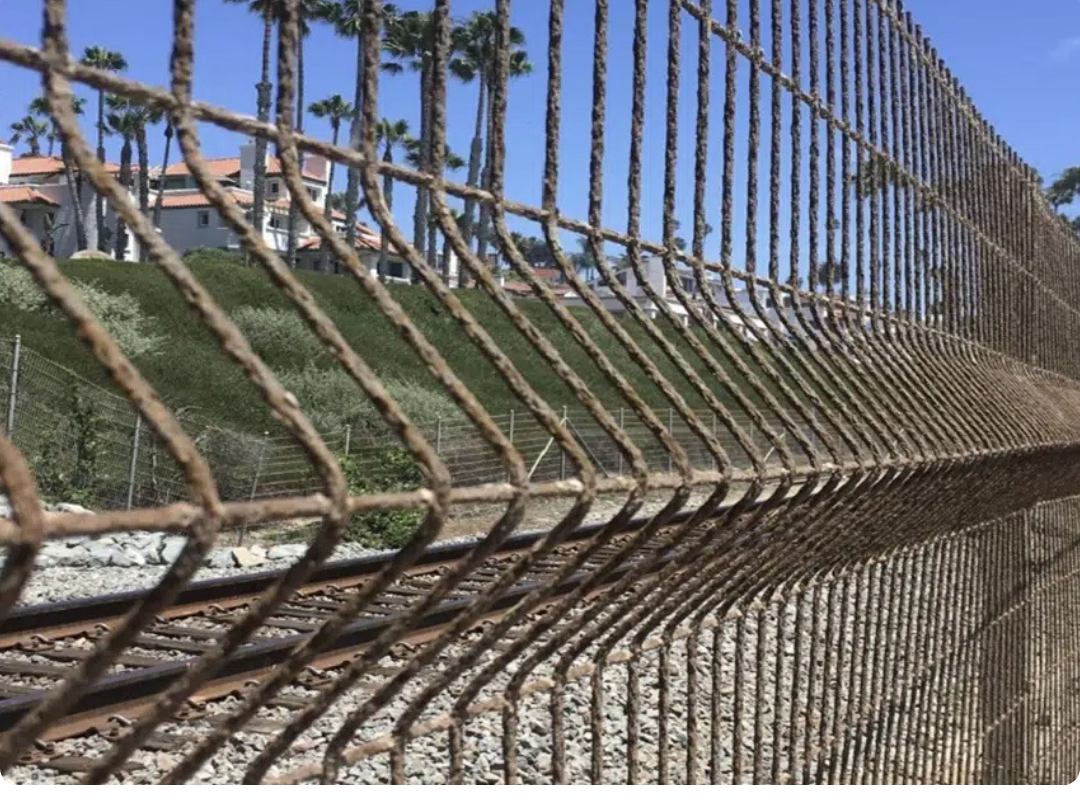 A fence. Along train tracks in San Clemente, California. But not just any fence. This one bent outward halfway up—zigzagging in a deliberate, almost artistic kink, like a wave frozen in metal.
