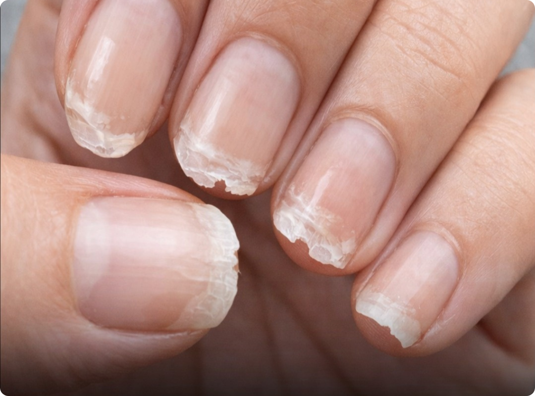 → Signs: Slow growth, white spots (not zinc-related, as once thought—often minor trauma), weak nail plate.