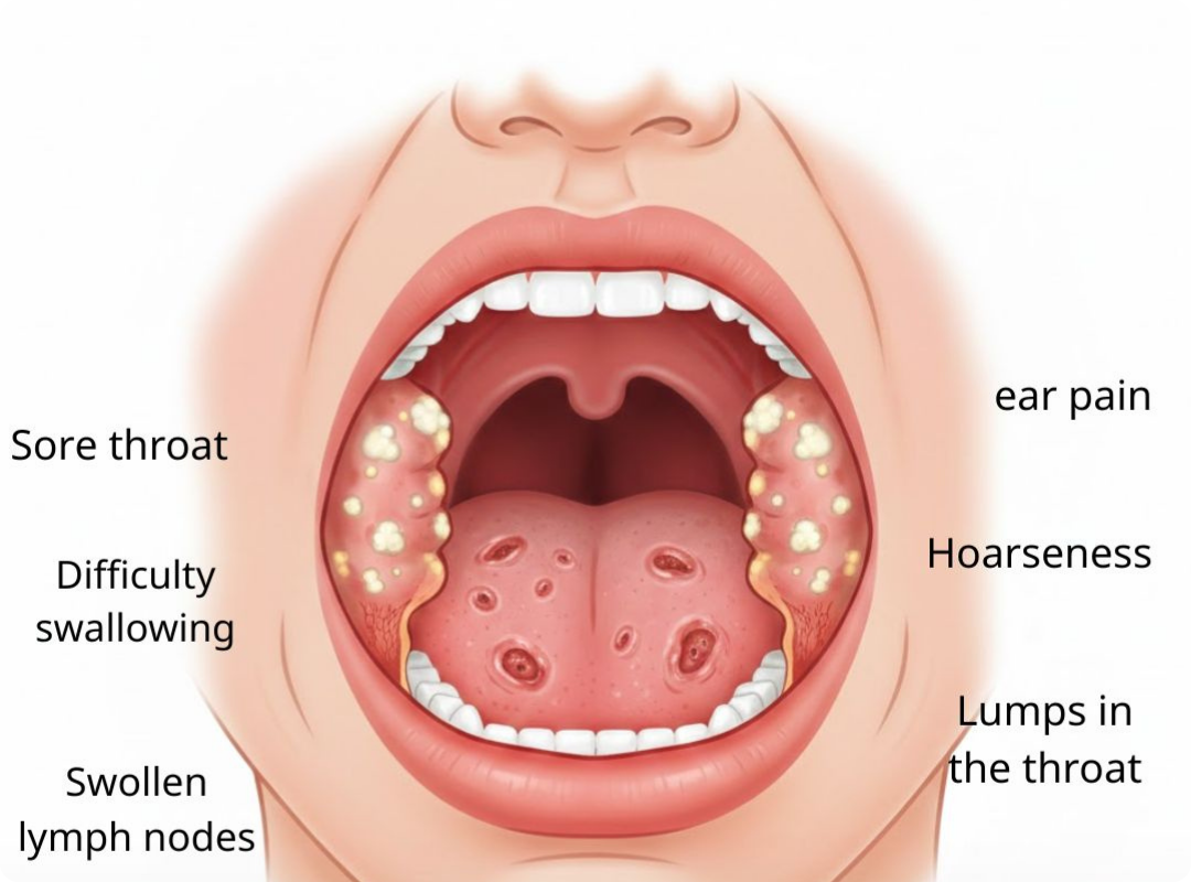 - Ear pain (often one-sided), which can occur due to shared nerve pathways